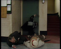 That in response to "The Girl" abandoning her game of hopscotch, which the Doctor only seems to recognise after a calculation on a pocket abacus. Nope, not a Scooby Doo how that's supposed to work, but hey, isn't it eccentric? Not in the novel, by the way, so presumably a bit of business worked out between McCoy and the Director?
