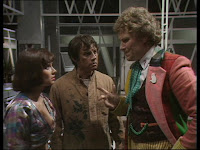Arriving on the space station, the 6th Doctor and Peri arrive in a darkened, rotting kitchen. And don't take off again. Loons.